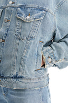 This cool denim jacket features a boxy fit and wide sleeves for a distressed look.