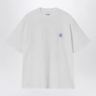 Carhartt WIP T-shirt in medium weight white cotton jersey, featuring a loose fit, graphic prints on the front and back, short sleeves, and a ribbed crew neck. Size and Fit - Model wears size L Model measurements: Height: 187 cm Chest: 102 cm Waist: 76 cm Hips: 92 cm