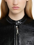 This stylish vinyl jacket is perfect for adding a touch of edgy sophistication to any outfit.