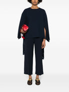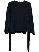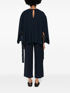 This navy blue top features a unique design with open sleeves and side tie fastening.
