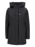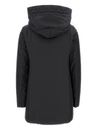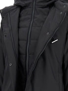 Stay warm and stylish in this layered design parka coat with a quilted hood.