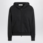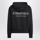 Fear Of God Essentials black brushed cotton sweatshirt, featuring double front zip closure, long sleeves with rubber logo patch, ribbed knit trims, dropped shoulders, two front pockets, hood with rubber patch on the back and raised logo lettering on the rear.