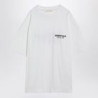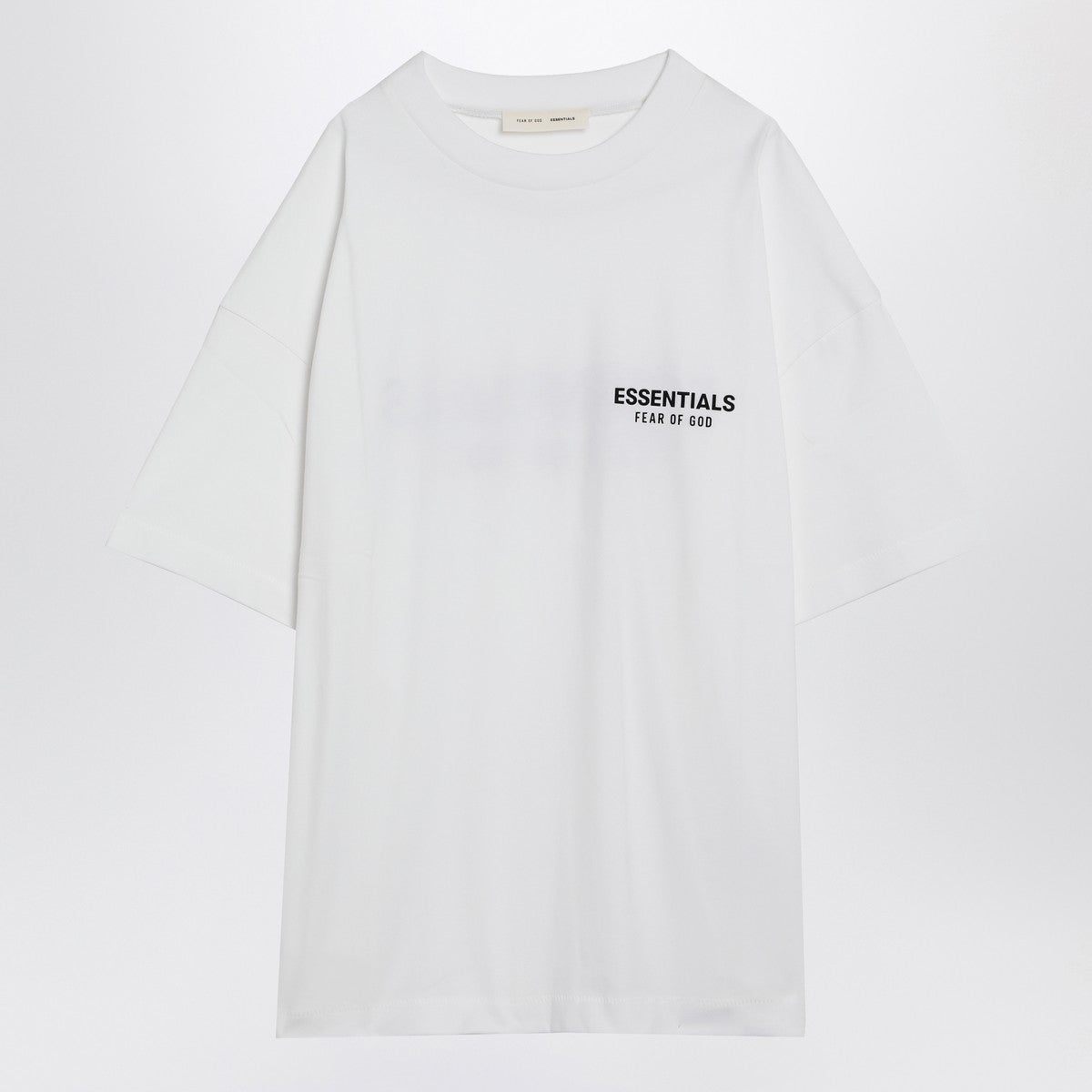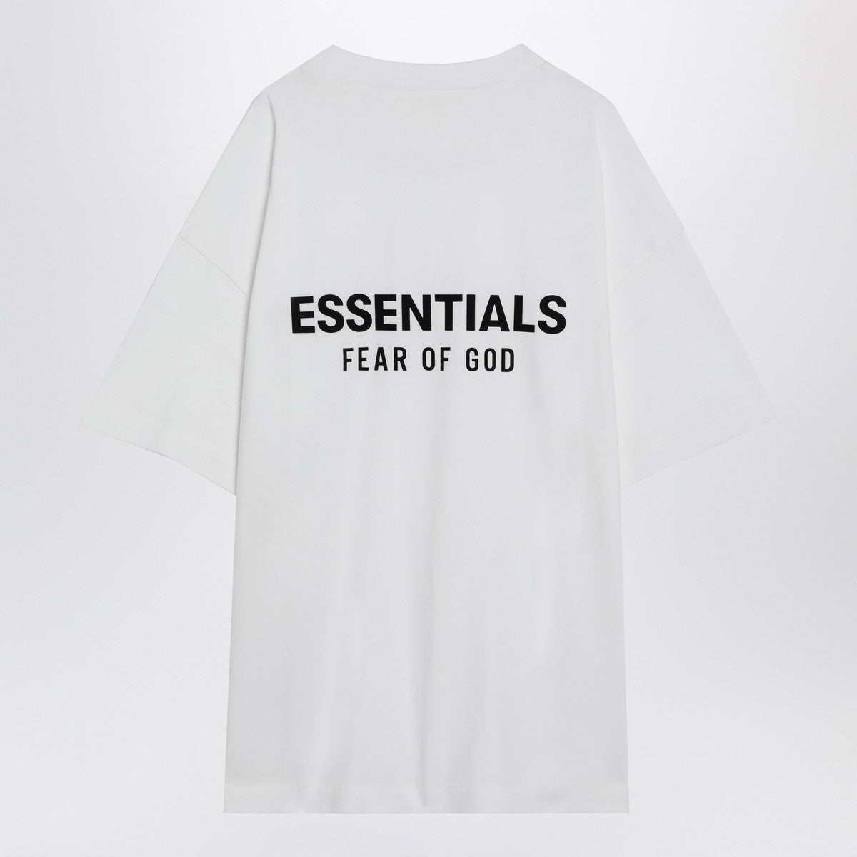 Fear Of God Essentials white cotton T-shirt, characterized by short sleeves, dropped shoulders, contrasting logo lettering on the chest and back, and ribbed crew neck. Size and Fit - Model wears size L Model measurements: Height: 185 cm Chest: 105 cm Waist: 85 cm Hips: 100 cm