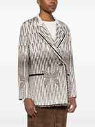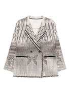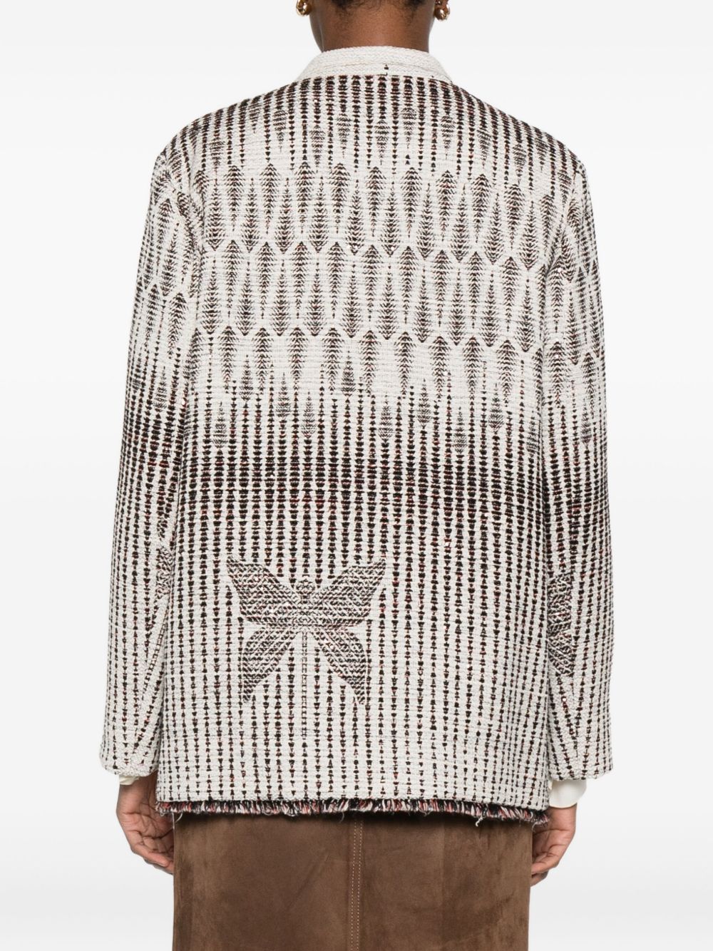 This cream jacket features a unique geometric pattern and fringed trim.