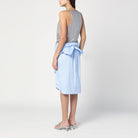 This sleeveless dress features a rhinestone upper and light blue cotton shirt design.