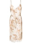 Elegant silk dress featuring a delicate floral print and lace detailing for a sophisticated look.