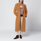 Single-breasted coat by Isabel Marant in a camel-coloured virgin wool blend, featuring a classic lapel, long sleeves with buttoned cuffs, a welt pocket on the chest, two side pockets, front button closure, and a back vent. Size and Fit - Model wears size 36 FR Model measurements: Height: 182 cm Chest: 79 cm Waist: 62 cm Hips: 90 cm
