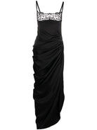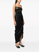 Make a statement in this stunning floral-embroidered asymmetric dress, perfect for any occasion.