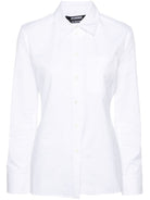 This crisp poplin shirt features a unique open-back design with adjustable belt.