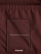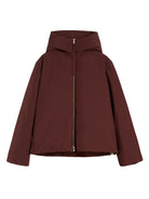 Stay warm and stylish in this chocolate brown, zip-front down jacket.
