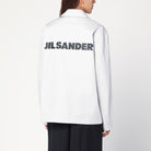 Light grey cotton taffeta shirt jacket by Jil Sander, characterized by contrasting logo lettering printed on the back, boxy and soft cut, flat collar, snap button closure, two welt pockets, and long sleeves with adjustable cuffs. Size and Fit - Model wears size S Model measurements: Height: 178 cm Chest: 84 cm Waist: 65 cm Hips: 93 cm