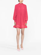This coral mini dress features frilled high neck and front tie fastening for a flattering fit.