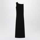 This elegant black cady dress features a draped bustier and jewel strap for a sophisticated look.