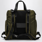 This backpack is crafted from green waterproof recycled nylon and has ample storage space.
