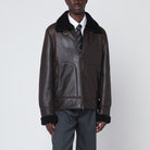 This dark brown leather jacket features a stylish double zip closure and adjustable collar.