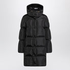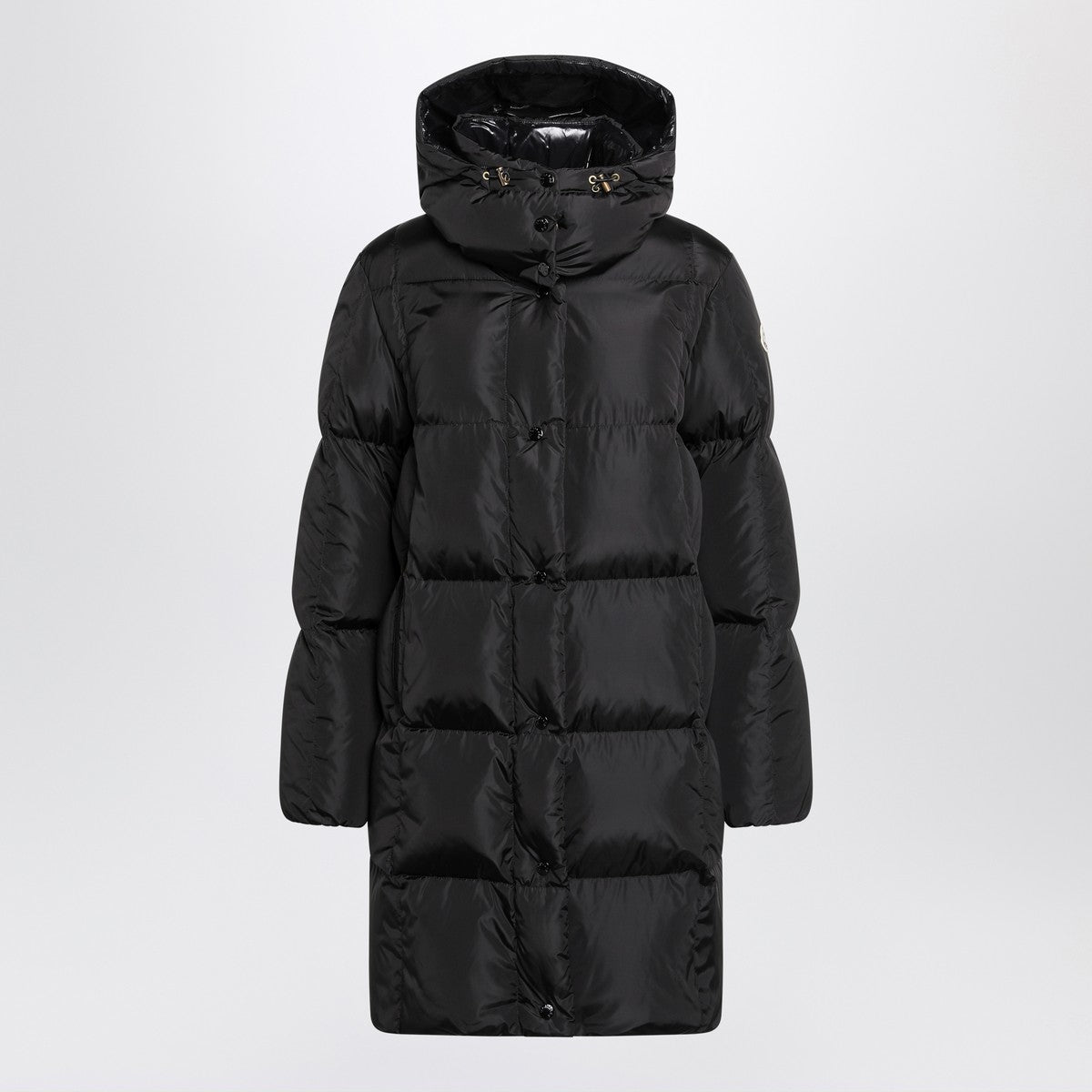 Long black nylon Moncler down coat featuring a padded design, removable and adjustable drawstring hood, zip and snap button closure, two side zip pockets, long sleeves with a logo patch on one, stand collar, and elastic cuffs. Size and Fit - Model wears size 1 Model measurements: Height: 178 cm Chest: 83 cm Waist: 63 cm Hips: 91 cm
