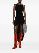 This chic black mini dress features an asymmetric drape for a modern look.