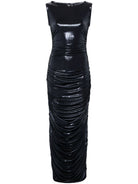 This navy blue dress features a glossy finish and a flattering, stretch design.