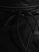 This stylish black skirt features an adjustable belt and modern asymmetric hem.