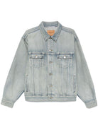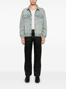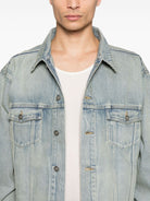 This denim jacket offers a classic look with a modern, slightly distressed edge.