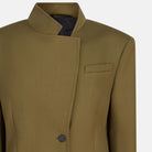 This wool jacket features a unique asymmetric design for a modern, stylish look.