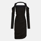 This elegant midi dress features a flattering off-the-shoulder design and fitted silhouette.