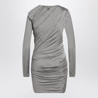 This grey mini dress features a draped design and asymmetric neckline for a chic look.