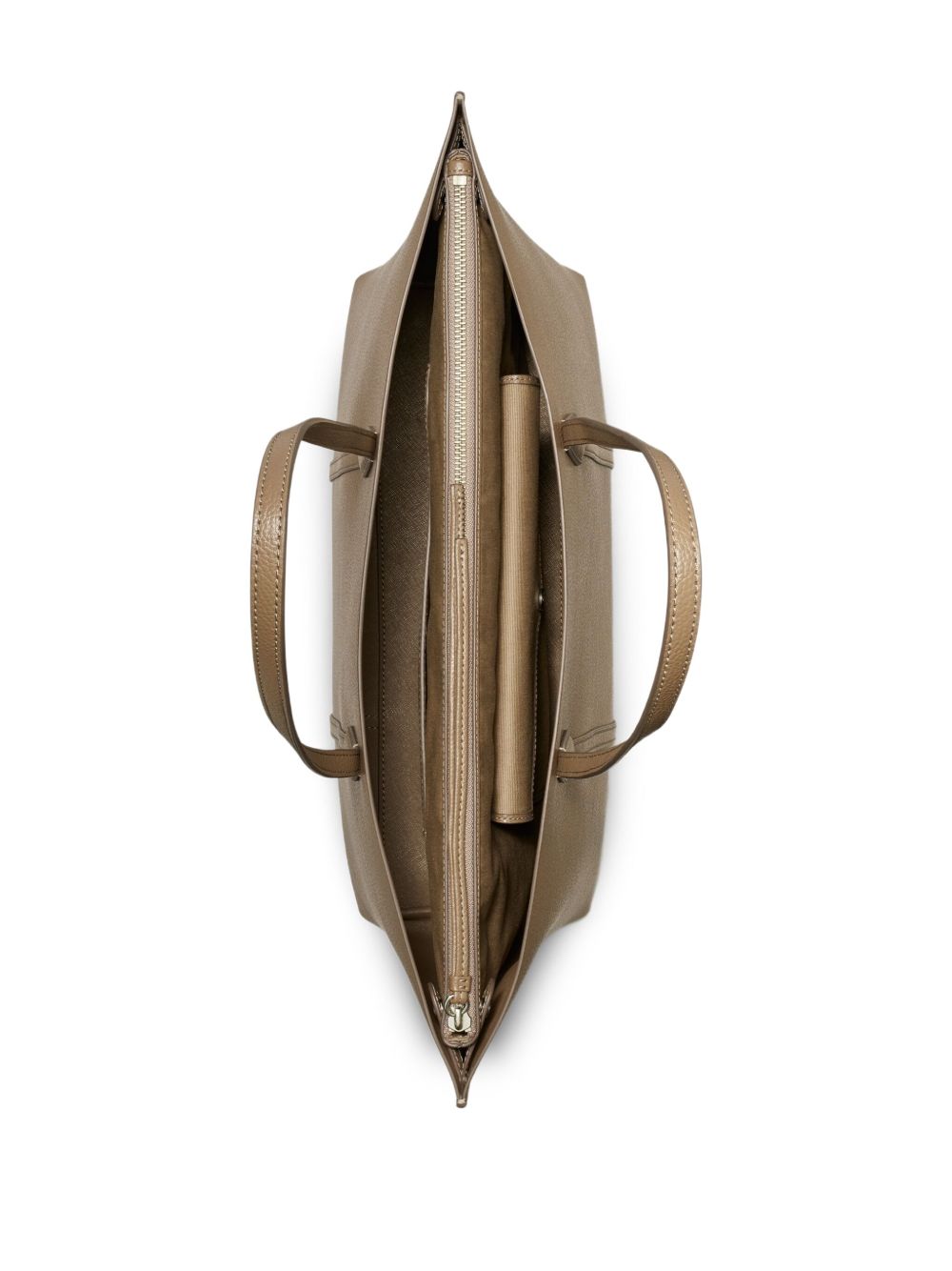 This elegant leather tote offers a structured silhouette and ample space for everyday essentials.