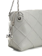 This light grey crossbody bag features a diamond quilted design and chain strap.