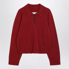 LouLou de Saison sweater in burgundy cashmere, featuring long sleeves, ribbed trims, dropped shoulders, polo-style collar with front buttons, and small tone-on-tone embroidery on front. Size and Fit - Model wears size S Model measurements: Height: 178 cm Chest: 83 cm Waist: 63 cm Hips: 91 cm