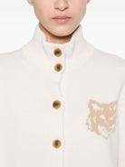 Stay warm and stylish in this wool cardigan featuring the iconic fox motif.