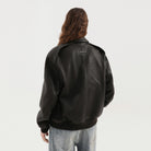 This stylish leather jacket features a shirt collar and ribbed wool cuffs for a classic look.