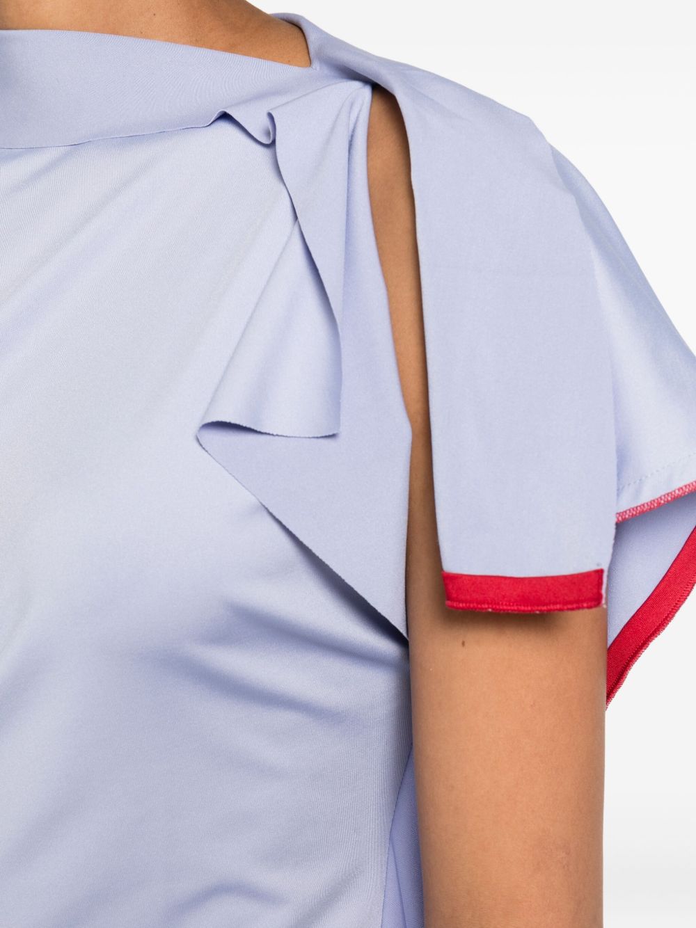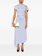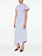 Elegant midi dress with draped detailing and an asymmetrical sleeve for a sophisticated look.