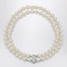 Vivienne Westwood necklace with two strands of white synthetic pearls and central platinum metal Orb detail with crystals. Size and Fit - Model wears size 1 Model measurements: Height: 182 cm Chest: 79 cm Waist: 62 cm Hips: 90 cm