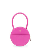 This fuchsia pink tote bag features a unique round design and detachable strap.