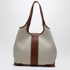 This elegant shopper bag is crafted from natural-coloured textile with refined leather trim.