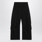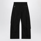 Dolce & Gabbana cargo trousers in black waxed cotton fabric featuring a low waist, front slanted pockets with vertical cuts, back zip pockets with vertical cuts, pleated flap cargo pockets on the sides, elasticated waistband with drawstring, and a washed, crinkled look.