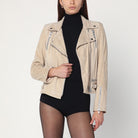 This light beige suede biker jacket features an asymmetrical zip closure for a stylish, edgy look.