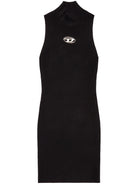 This black ribbed knit dress features a sleek design and comfortable fit.
