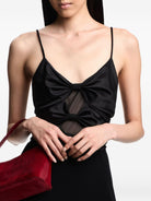 This elegant black dress features a flattering gathered waist and delicate bow detail.