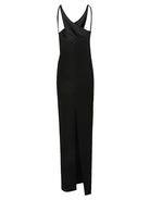This elegant long dress features a flattering cut-out detail and a smooth silk crepe fabric.