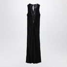This black midi dress offers a sleek silhouette with a modern mesh detail.