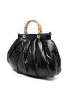 This stylish handbag features a unique quilted texture and bamboo handle.
