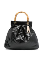 This stylish handbag features a unique bamboo handle and elegant quilted effect.