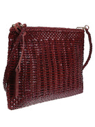 This stylish handbag features a rich burgundy color and a unique woven pattern.