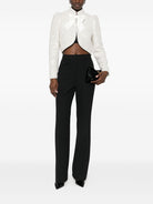 This white jacket features a bow detail and sequin embellishments for a stylish look.