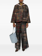 Stay warm and stylish in this unique patchwork design hooded jacket.