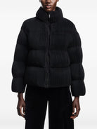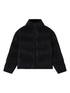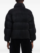 Stay warm and stylish in this pleated, high-neck puffer jacket.