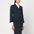 This navy blazer features a timeless pinstripe pattern for a sophisticated look.