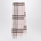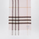 Burberry cashmere scarf, featuring a pink Check Archive pattern, fringed edges, and a logo label.